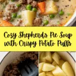 This Shepherd’s Pie Soup offers a comforting and hearty twist on the traditional shepherd’s pie by transforming its classic flavors into a rich, savory soup topped with golden, buttery potato puffs. Perfect for chilly days, it combines tender ground beef, fragrant herbs, and a medley of vegetables in a savory broth, finished with fluffy mashed potato puffs baked to perfection.